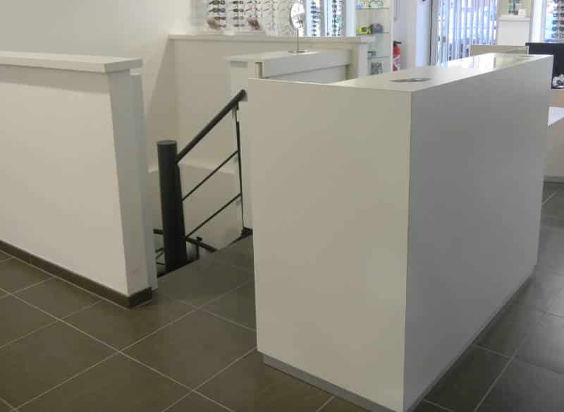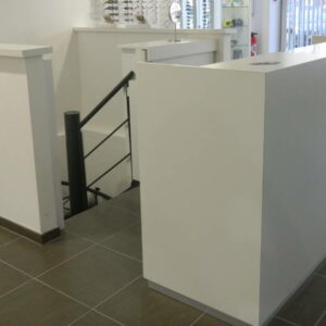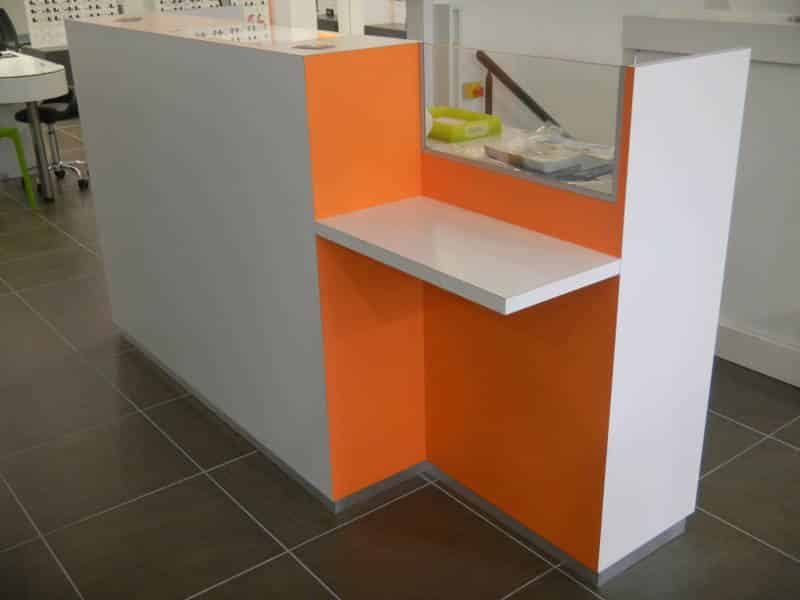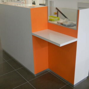 - Banque d’accueil en stratifié 2 tons (blanc, orange) intégrant un poste de polissage avec verre de protection ainsi qu’un poste informatique recouvert de verre pour permettre de voir l’écran de l’ordinateur par transparence.