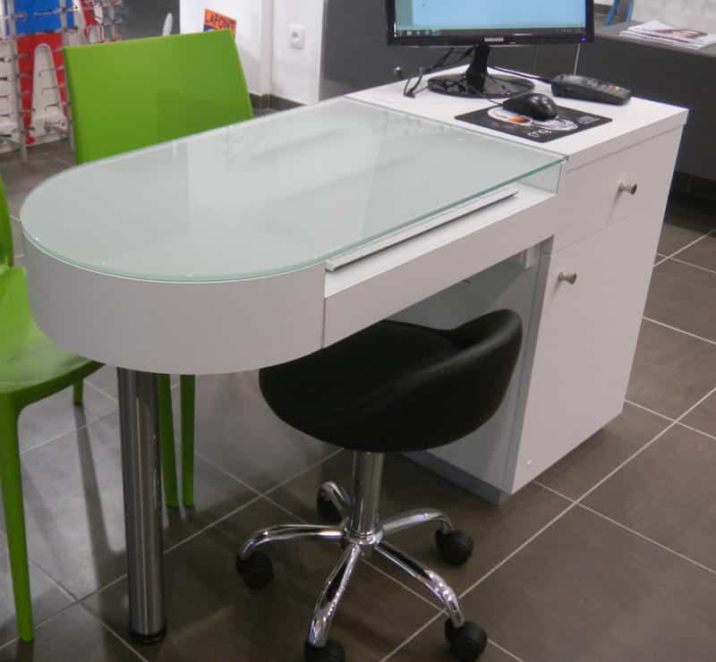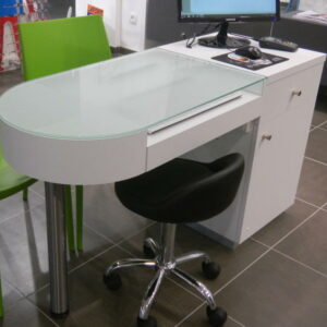 - Bureau d’accueil en stratifié blanc recouvert de verre dépoli.