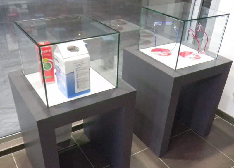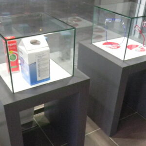 - Présentoirs en vitrine avec tiroir masqué et cube en verre collé aux U.V.
