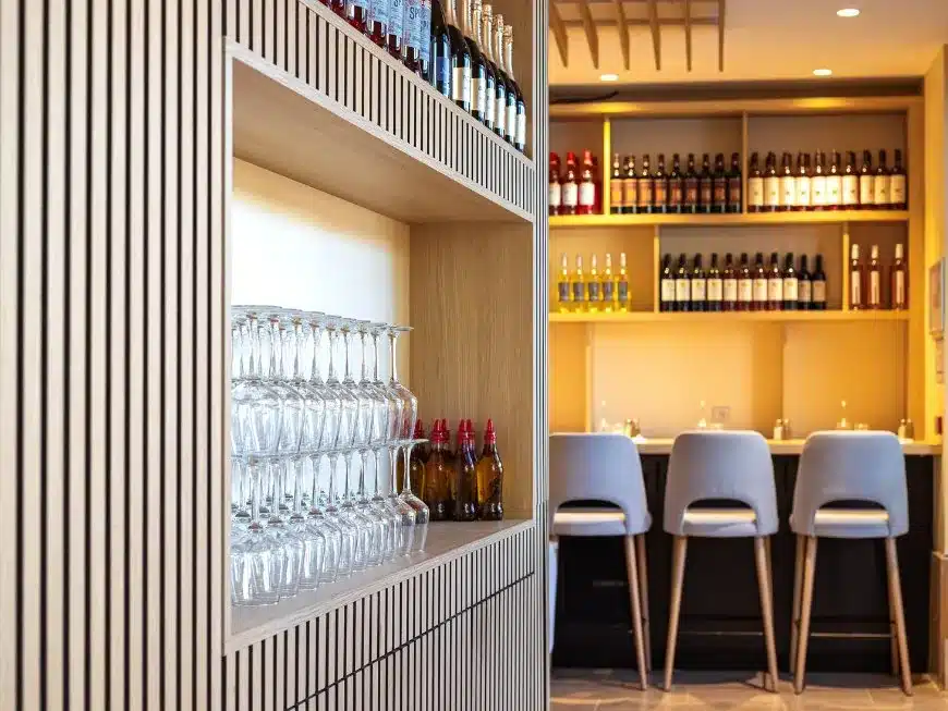 - Arrière bar avec rayonnage. Meuble technique à l’arrière bar, il intègre les équipements froid, machine et moulin à café ainsi que les différentes alimentations pour les équipements du bar. Le Rayonnage suspendu vient se fondre dans le décor ambiant.