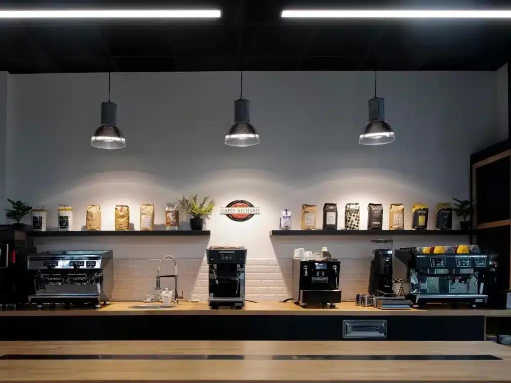 Pour la réalisation de son nouveau showroom Midi-Pyrénées / Massif Central situé à Gratentour au nord de Toulouse Il a fallu imaginer un agencement dans l’esprit de la maison avec une identité forte conjuguant à la fois tradition et modernité. C’est M. Christian GOUT, architecte DPLG, qui a relevé le défi en proposant une association subtile de matériaux authentiques (bois, acier) et de matériaux plus modernes (résine acrylique). Les tons miels du chêne naturel se mêlent au noir profond de la pierre acrylique pour sublimer le café torréfié – tout un arôme!