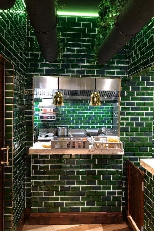 - L’arrière bar composé d’un desserte, d’un rayonnage en escalier et d’un rayonnage avec étagères profilées fondues dans la fresque murale et intégrant un éclairage LED.