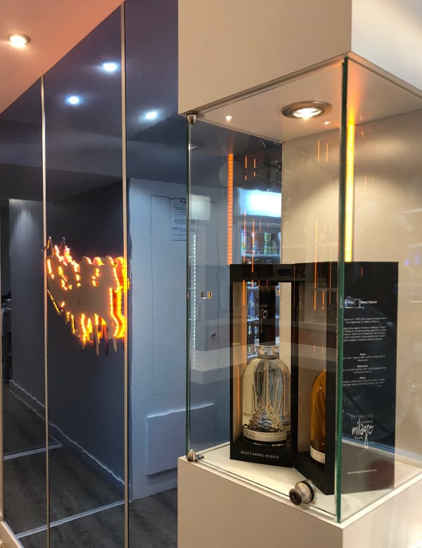 - Desserte arrière et rayonnage avec éclairage LED intégré aux joues latérales et fond en sibu pour des effets de couleurs et lumières rasantes