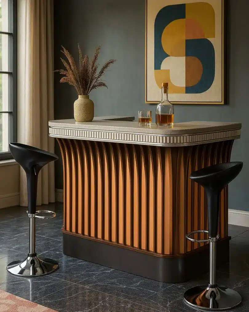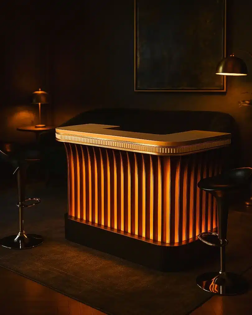 Lignes sculpturales, rythme vertical et jeux de lumière donnent vie à un mini bar d’exception, pensé comme une pièce maîtresse de décoration.