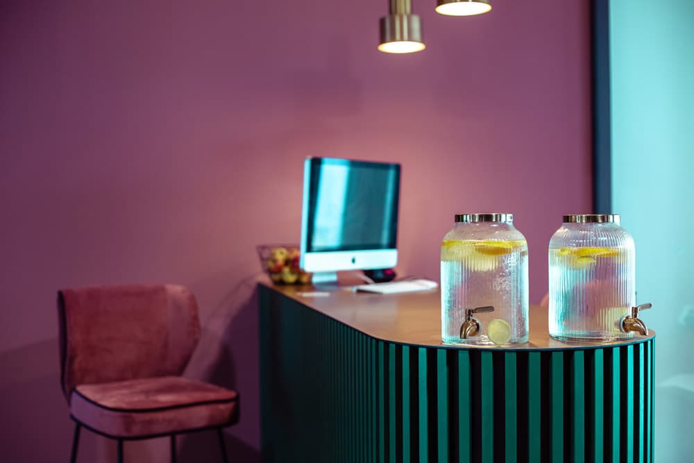 Aranda-Mas a réalisé la banque d’accueil avec une décoration en carrelets de bois et des tons verts, noir et doré (laiton brossé).