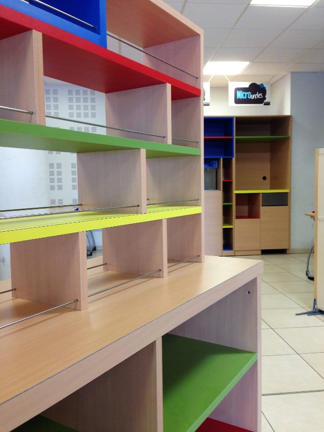 Pour le restaurant de l’école, c’est donc presque “naturellement” que les couleurs s’entremêlent, à l’image de la diversité culturelle de l’EUROCAMPUS. En outre, les meubles réalisés s’insèrent entre la salle de restaurant aux couleurs gaies et le self dans les tons bois. A la jonction des deux espaces les couleurs se rencontrent et se mélangent aussi bien sur la desserte mobile que sur le meuble multifonction.