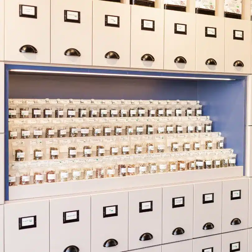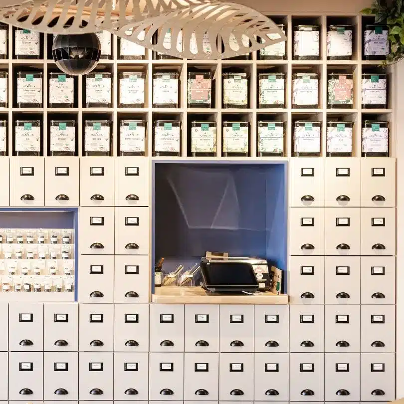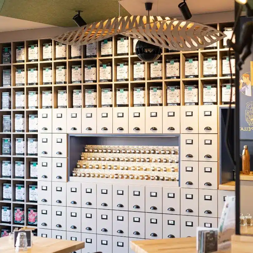 - un mur de rangement à tiroirs et casiers, évoquant les anciens comptoirs d’apothicaires;