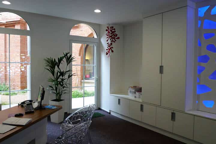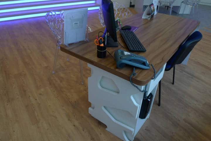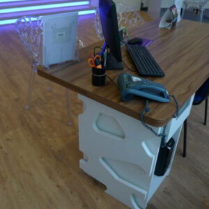 - bureaux en stratifié blanc, dessus bois avec des flancs qui reprennent les motifs des claustras pour une harmonie parfaite
