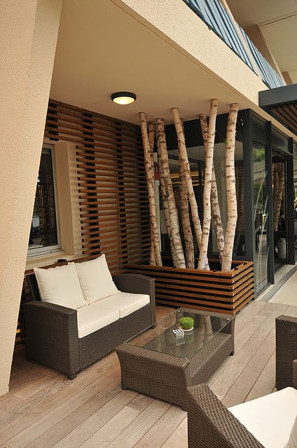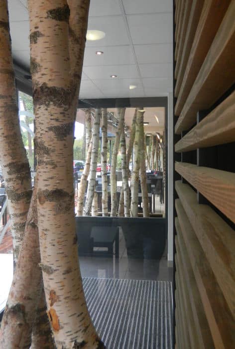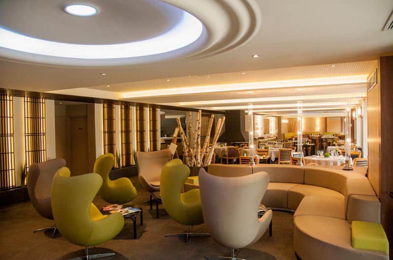 Le bois s’invite sous toutes ses formes dans les différents espaces et les troncs d’arbres accueillent le voyageur dès l’entrée de l’hôtel et l’accompagnent dans la salle de restaurant puis le guident sur la terrasse du bar où il pourra profiter d’une vue magnifique sur le lac.