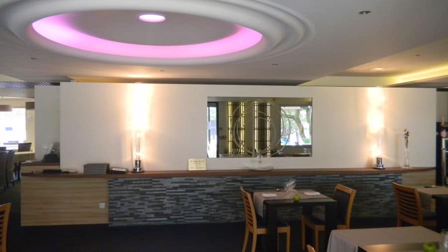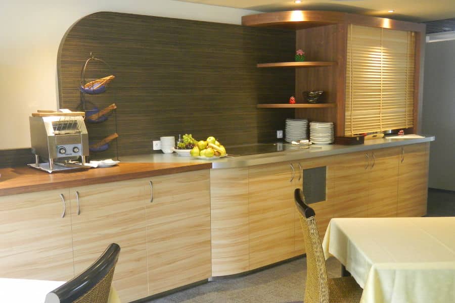 - Cloison séparative entre l’office et la salle de restauration avec emplacement pour cave à vins, miroir, meuble caisse côté salle et agencement avec placards, bac à serviettes et tiroirs à couverts côté office.