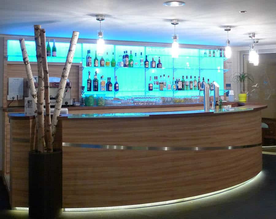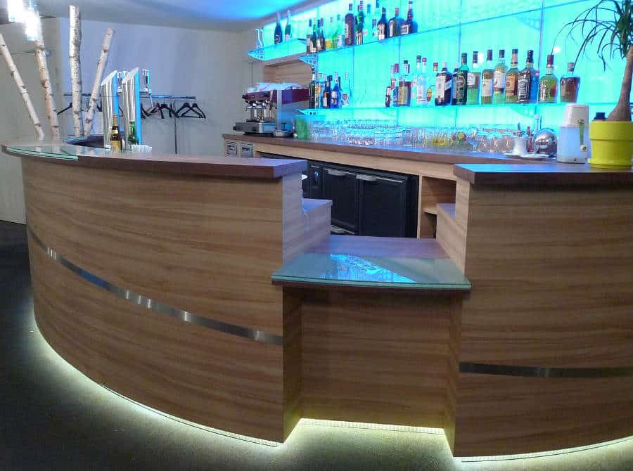 - Comptoir de bar avec tablette en verre brisé et rayonnage lumineux avec étagères en verre.