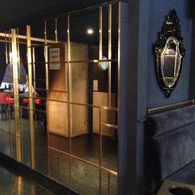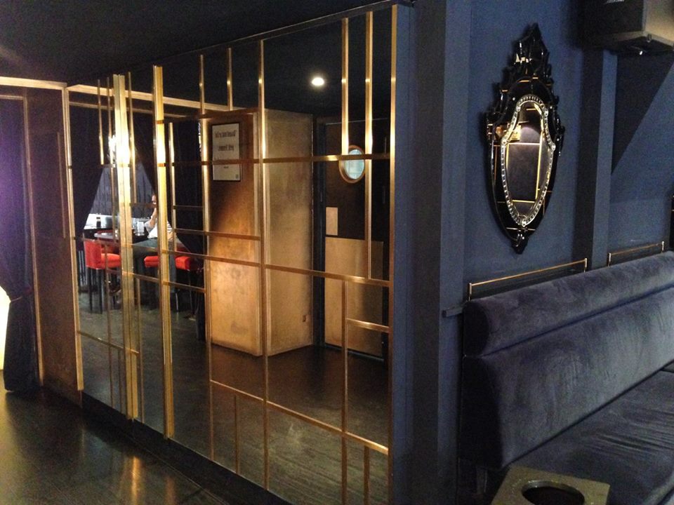 - habillage complet d’un mur et de ses portes rendues invisibles à l’aide d’un décor combinant miroirs et laiton.