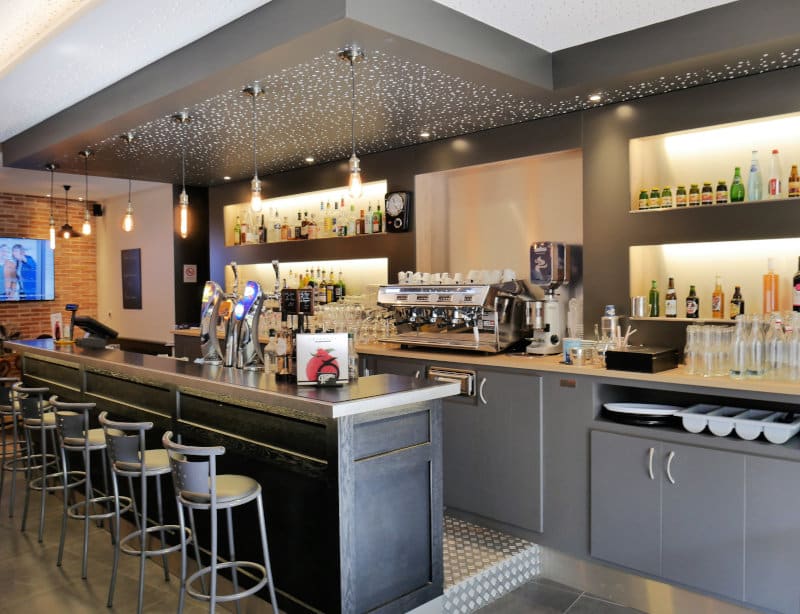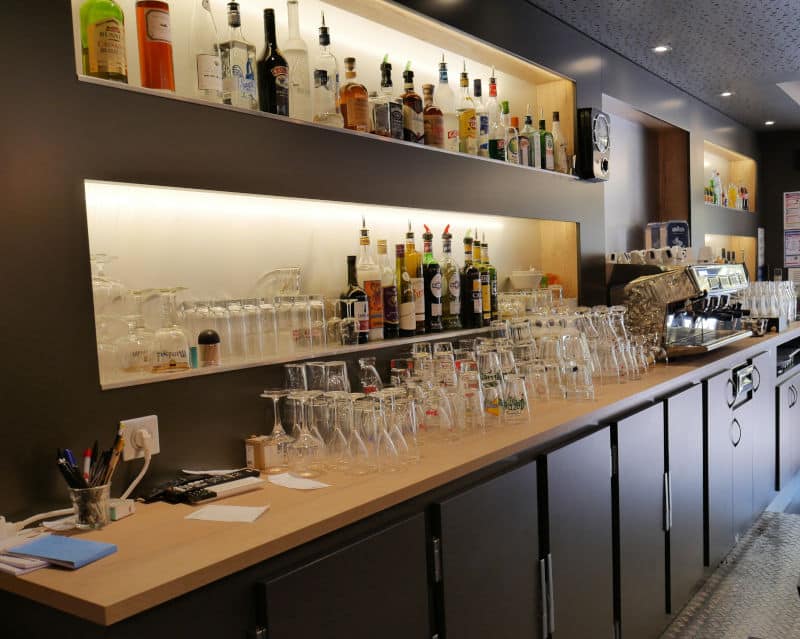 - Desserte arrière et rayonnage sur fond miroir en trompe l’oeil avec effet d’optique.