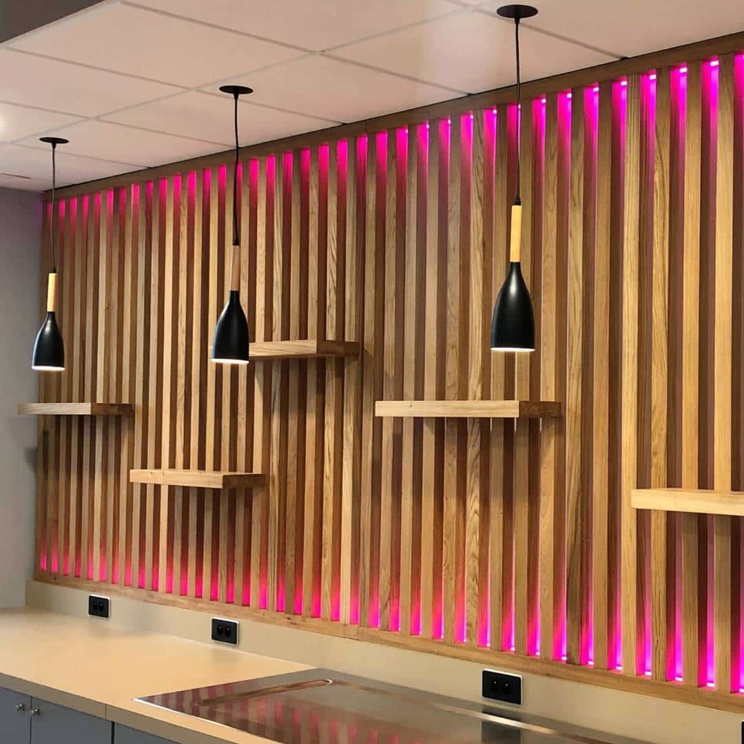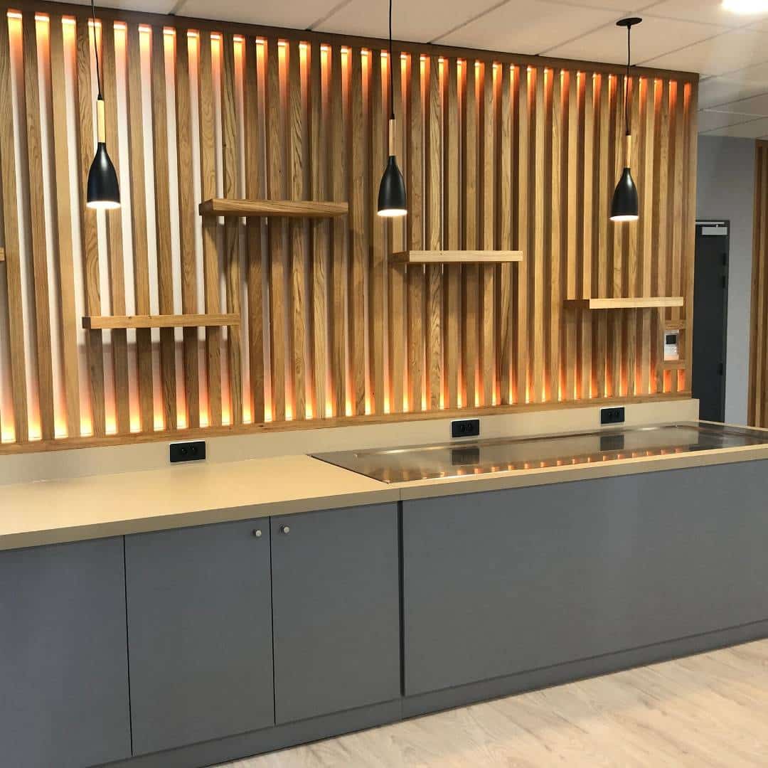 - Desserte réfrigérée en salle avec étagères et décoration en chêne