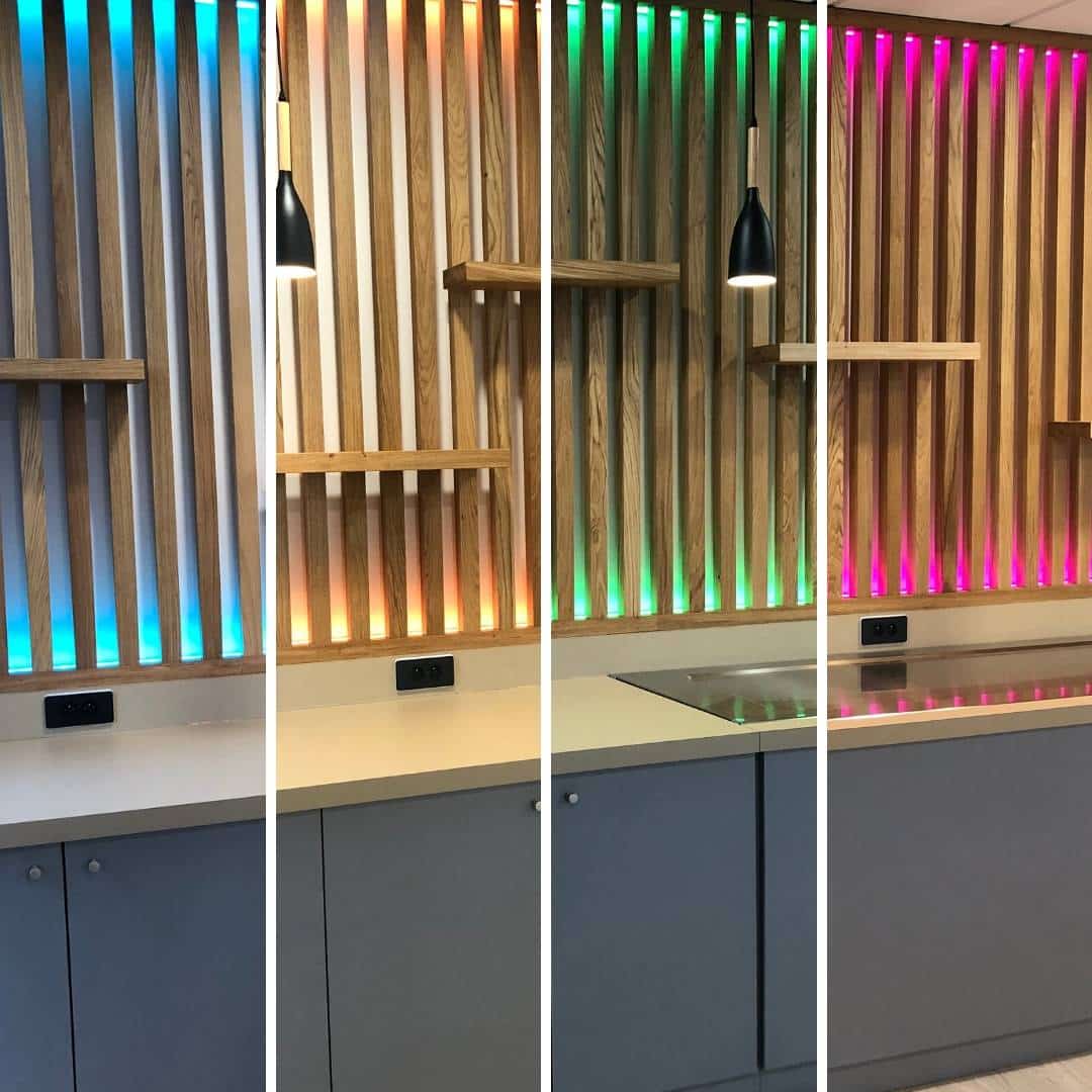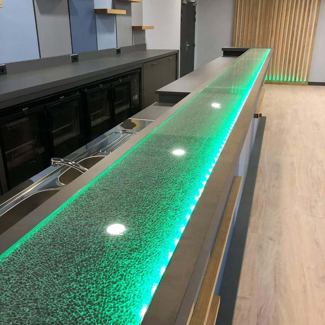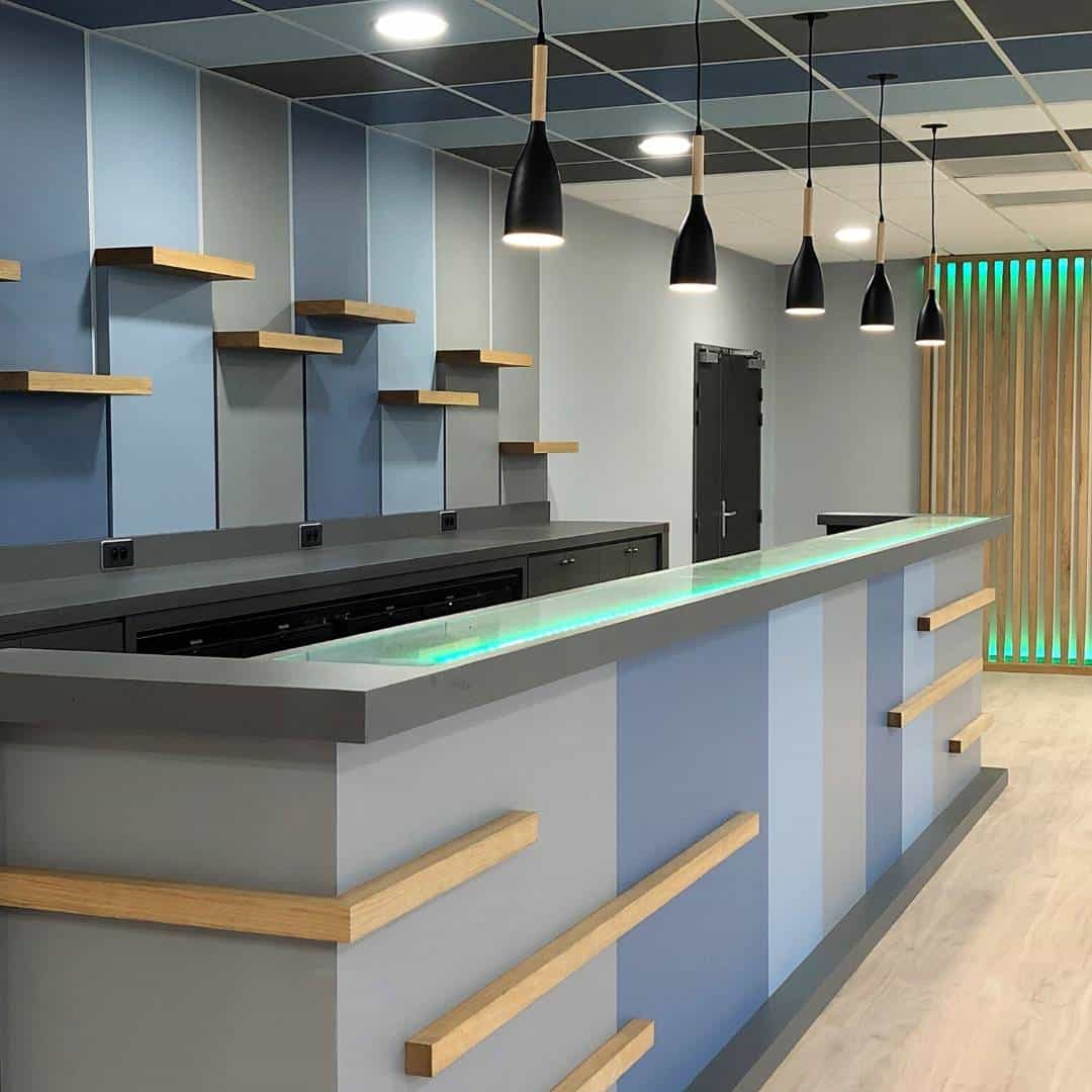 - Comptoir de bar tons gris bleu avec décoration bois massif et dessus piste en verre granité rétroéclairé