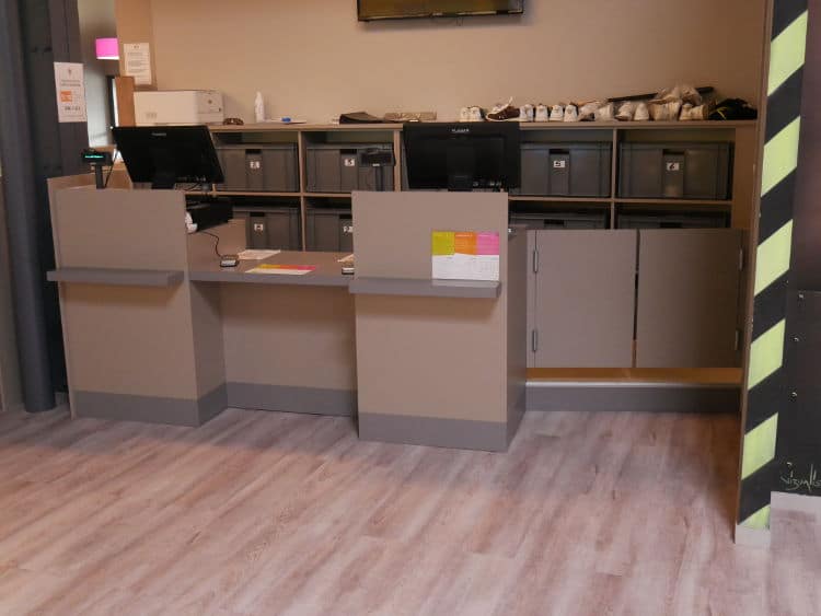 - Dessertes à l’arrière des comptoirs et dans la salle qui intègrent des frigos, fontaines à eau…