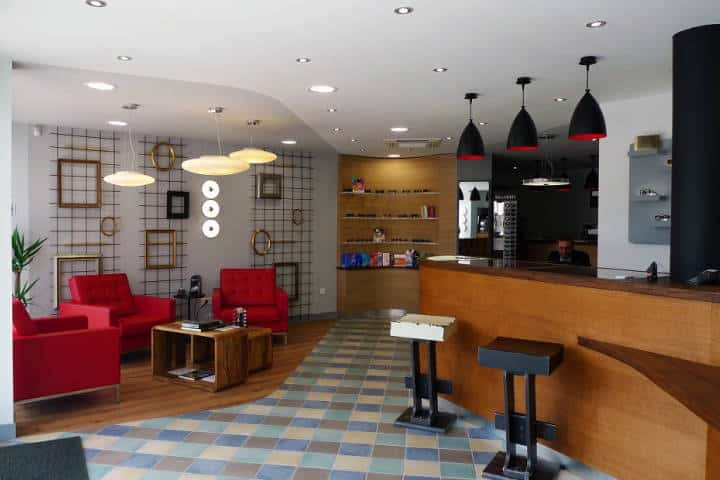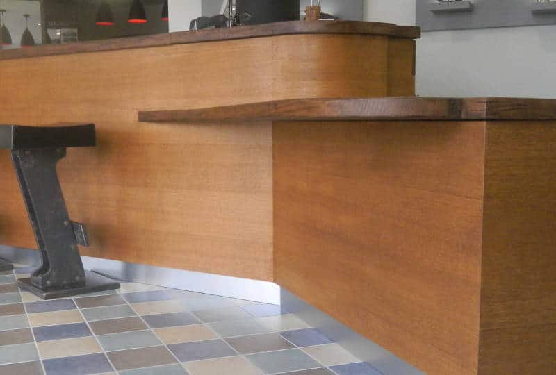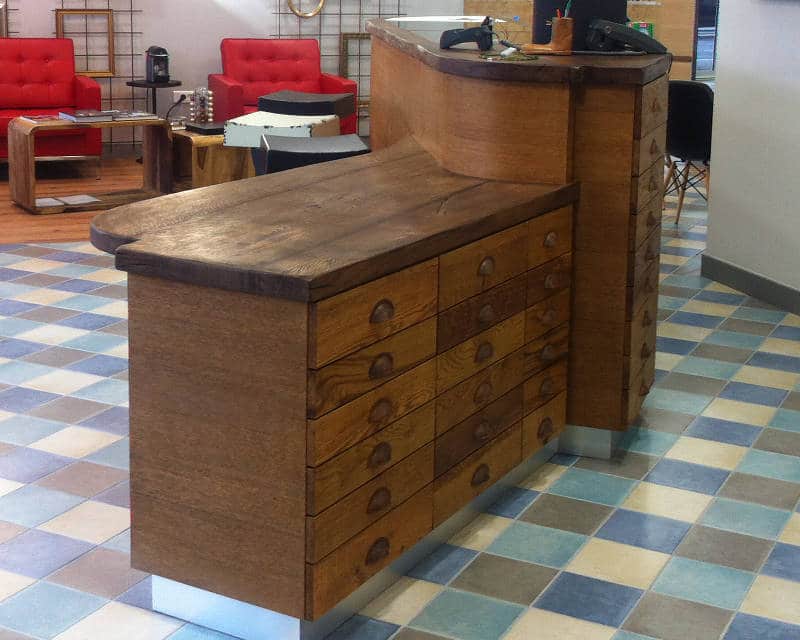 - banque d’accueil conjuguant tradition avec le bois et modernité avec du verre teinté en rouge