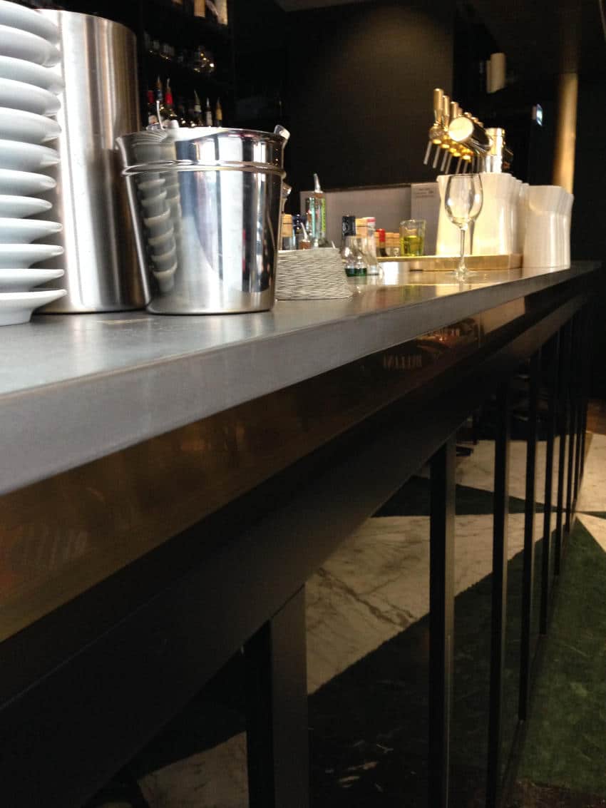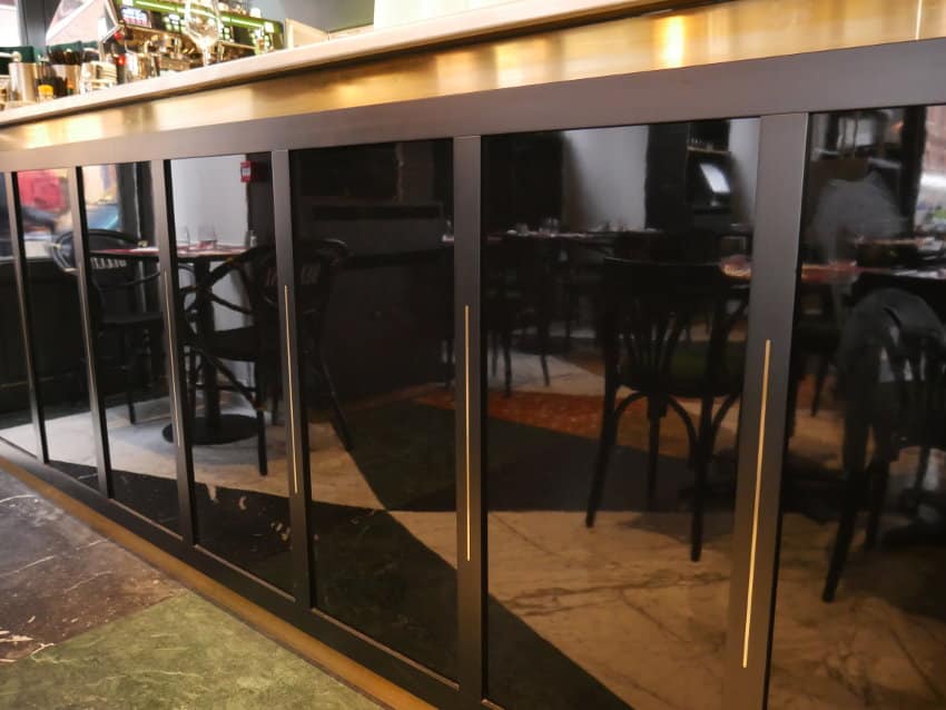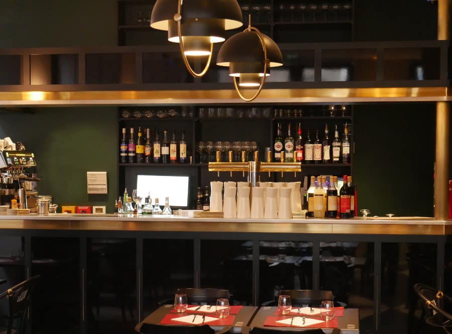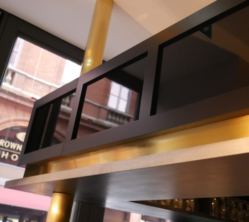 - Ciel de bar auto-porteur sur colonnes laiton, bandeau étain.