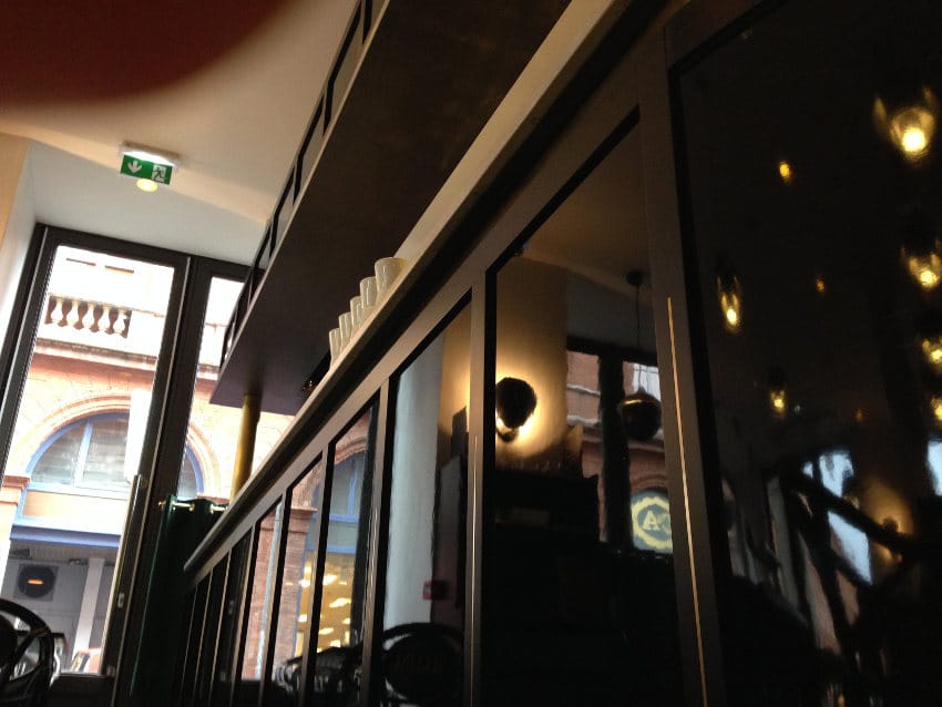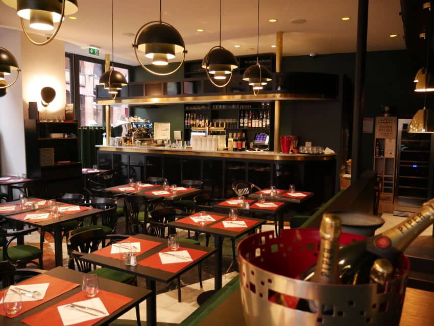 La décoration intérieure de la Brasserie italienne reprend des éléments à la fois très classiques et très modernes. Ainsi, le sol en marbre blanc, rouge et vert évoque les palais florentins alors que le design des luminaires est très contemporain.