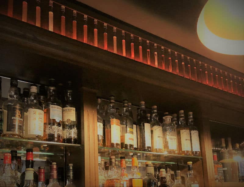 - Un bandeau de Whiskies avec un dégradé complet de fioles éclairées contenant le précieux breuvage… un arc-en-ciel en Whisky!